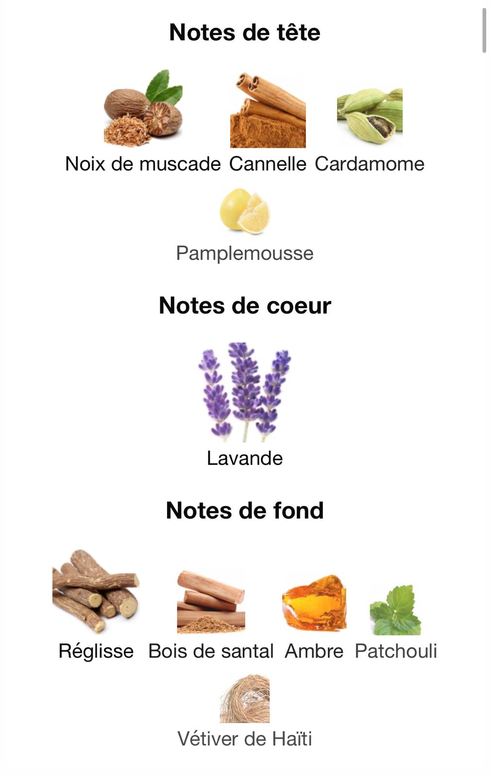 Tête : Noix de Muscade, Cannelle & Pamplemousse – une épice vive qui électrise immédiatement.